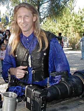 actually STAYED there, mind you! When the Royal Parade passed on its' way to the Tournament Field, for example, I was out in the lane capturing portraits of the LRF Gentry (Photo, Above: Lance (Far left) escorting a lovely Lady of the Court; and Lady Ilise AKA Virginia N. Weinberg (Right of Center, in blue and burgundy) among them. We would soon get to know them -- and many others! -- much better before this day ended!). There was also a foray to the Tower of the Crazy King (AKA James Creel) to enjoy his one-man performance. He definitely has a Royal sense of humor! For the most part, though, I did my usual wanderings, taking portraits as the opportunities presented themselves (Photo, Above Left: such as catching Kiko and Wise Anne together in the lane as the shadows lengthened toward sunset). I wasn't alone. The Stalkwells' friends -- Matt, Diane and their young daughter -- also showed up at the dining area and stayed awhile, chatting with the LRF players. Talk about a real case of "lens envy"! While Matt paused briefly from taking photographs with his REALLY IMPRESSIVE camera system, I