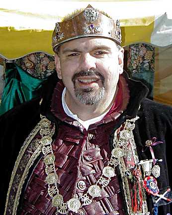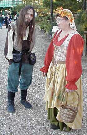 crew, merchants, entertainers and various friends of LRF -- began arriving shortly thereafter. It seems Lance had been quite busy indeed inviting everyone he knew to dinner! For our part, the five of us -- along with Lance and his crew -- staked out the far end of the table, sitting together so we could get better acquainted while enjoying a good meal. Regina, of course, made sure that Kiko sat next to her! We eventually wound up with some 25 to 30 LRFers that evening, laughing and talking and sharing a great time together after faire hours. What with all the comings and goings -- folks kept arriving, staying awhile and then leaving -- it was right difficult to say exactly how many showed up there at Brady's, but with all the great company, good food and lots of fun conversations, it just kept getting better and better! So it shouldn't've been a surprise that, in the midst of this impromptu celebration, to have both the King and Queen of LRF show up (Photo, Above Left: King John AKA Chuck Davis; Photo, Below Right: Queen Anne AKA Dionne Charlet)!! Furthermore, it also turned out that it was King John's birthday, so our little "dinner party" -- which'd quickly grown into a major "Feast" -- suddenly turned into a ROYAL BIRTHDAY BANQUET in his honor!!! Fortunately, I'd brought several jugs of Thor's Hammer, my homemade hard cider, to LRF with the express purpose of sharing it with the folks there. Since Chuck turned out to be a drinking man, we retired to my truck for a quick sip during a brief lull in the festivities. He pronounced it good after a considered taste, so I was more than happy to gift him a couple of jugs by way of a birthday present! Quite frankly, I was most impressed with both of the LRF Royals. During this feast,