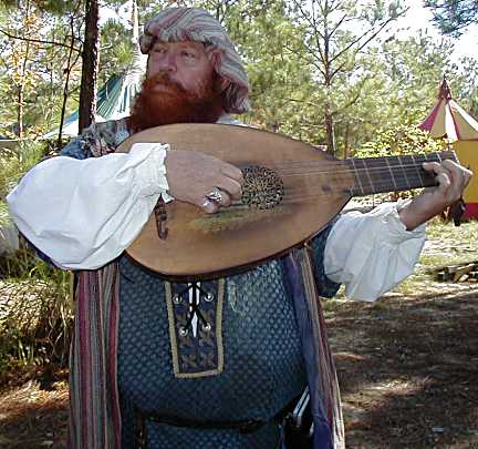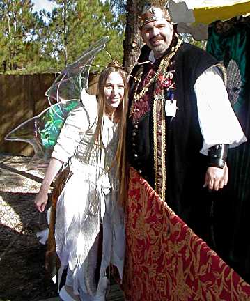 Up to the Gate we all marched, pausing only long enough for a group portrait, then on to faire! Once inside, our first stop was the Royal Pavilion, to meet and greet with the LRF Royals. Alas, Queen Anne (AKA Dionne Charlet) was tending to other duties elsewhere, but King John (AKA Chuck Davis) immediately recognized Regina from the Royal Feast at Brady's and greeted her warmly. She was then formally introduced to King John as "Aviana, Faerie Ambassador from Texas" (Photo, Above). Besides His Majesty, Aviana was also introduced to other members of the LRF Royal Court, all of whom complimented her on her beautiful costume, particularly her marvelous wings and her wond'rous long hair as well. Needless to say, Aviana simply glowed as she basked under all this attention! Hardly had we left the Royal Pavilion than we met Craig of Farrington (Photo, Below), serenading fairegoers in the lane. He saluted Aviana's beauty with true Shakespearean eloquence and grace -- all of which delighted her immensely, of course -- before launching into one of his rowdy, bawdy ballads which left us all weak with laughter.