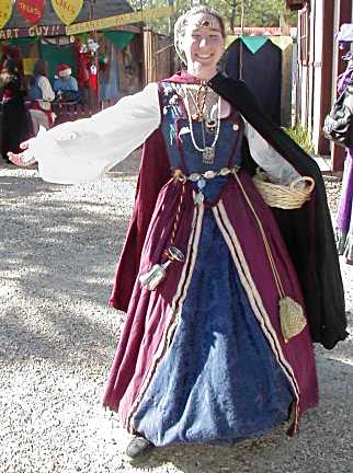 (Photo, Right: Lady Ilise AKA Virginia N. Weinberg, for example, showing off her beautiful Court garb) whichever way I turned. Fact is, between all the meeting and greeting I did this Saturday, I just never made it out to the Lists until mid-afternoon! First, for instance, I met Ron Haring and "Little" John, his booth Manager, at Castle Creations by the lake (Photo, Below: Castle Creations is the octagonal building in this view, the second booth from the left). I had missed Ron the first time I visited LRF this year as he was running his jewelry booth at another faire. It was luck, in fact, that he was at LRF this weekend at all: he was actually returning home from yet another show and decided to check in with Little John on his way by! So after the usual introductions, we all talked together awhile, catching up on our personal news and happenings. I always enjoy chatting with Ron since -- being a professional faire merchant -- he invariably has lots of fascinating road stories and plenty of circuit gossip to share whenever/wherever we meet. It also doesn't hurt that both Ron and Little John have a taste for hard cider! So before we parted, I decided to gift them both with a jug each of "Thor's Hammer(tm)", my own homebrew. Which meant taking the l-o-n-g hike back out to my truck to fetch the brew, making security arrangements for them to pick it up after faire hours and then returning to Castle Creations to share the details with them. At that rate, needless to say, I was not getting out to the Tournament Field fast!!!